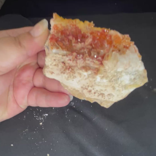 This Vanadinite on Barite cluster combines earthy weight with subtle, natural beauty. A generous barite base supports scattered red vanadinite crystals that shimmer softly across the surface. The pale matrix contrasts beautifully with the deep tones of vanadinite, creating a grounded and visually balanced display piece.