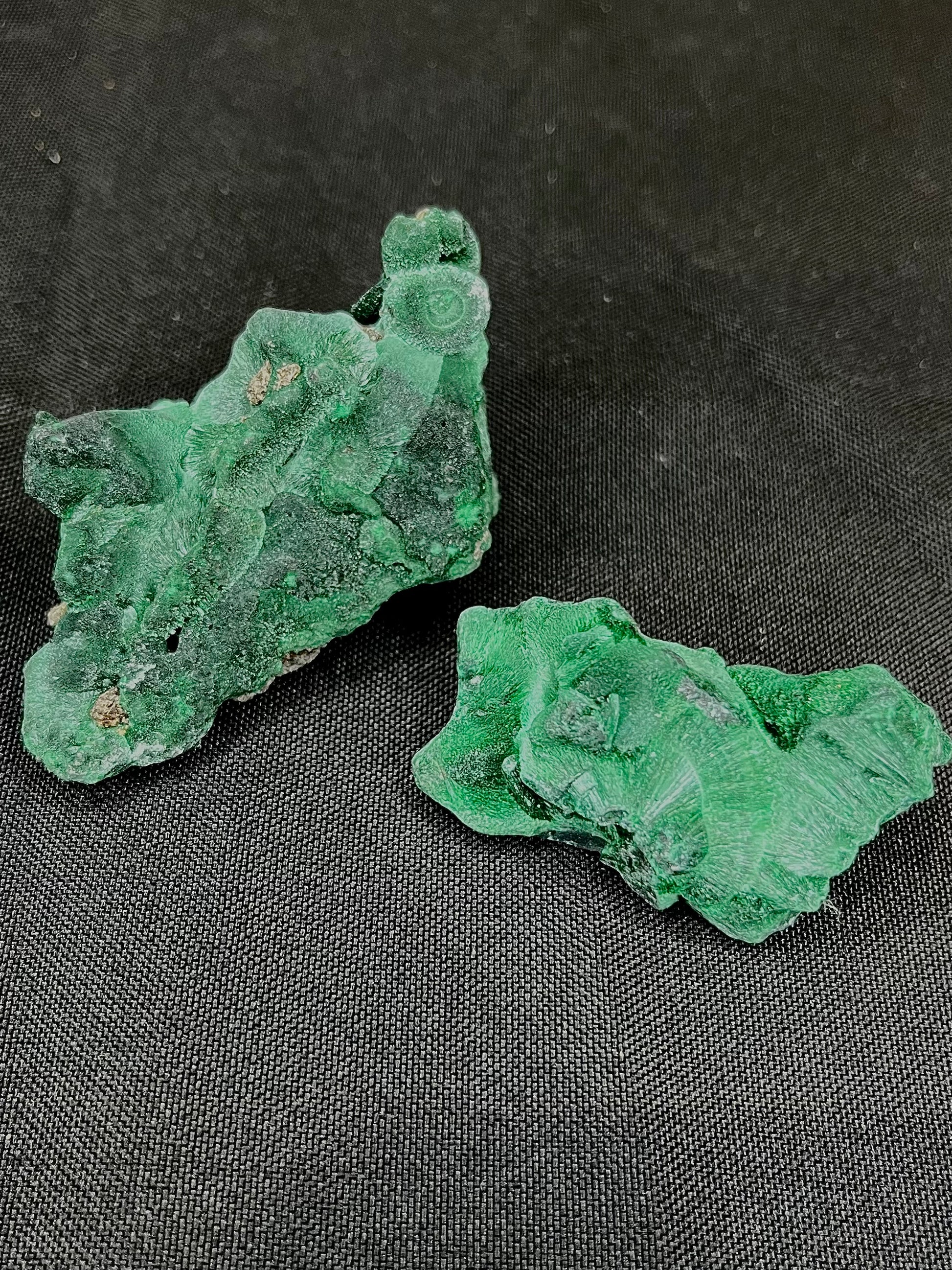 Malachite has long been treasured by collectors for its striking banding and chatoyancy, and these fibrous formations take that beauty to another level. Both pieces are entirely natural, with no polishing or treatment — just the raw, vibrant energy of malachite in its purest form.